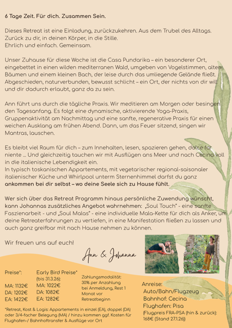 Ann leitet die Praxis durch den Tag und Johanna bietet zusätzlich Faszienarbeit und Mala-Coaching.